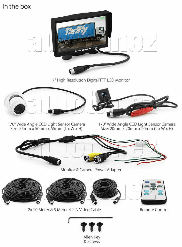 This is a set of standard caravan 2-infrared CCD camera system with 7-inch TFT LCD digital monitor to assist you in your daily driving. It gives you a complete view and ability to assess the surrounding of your vehicle in real-time.
